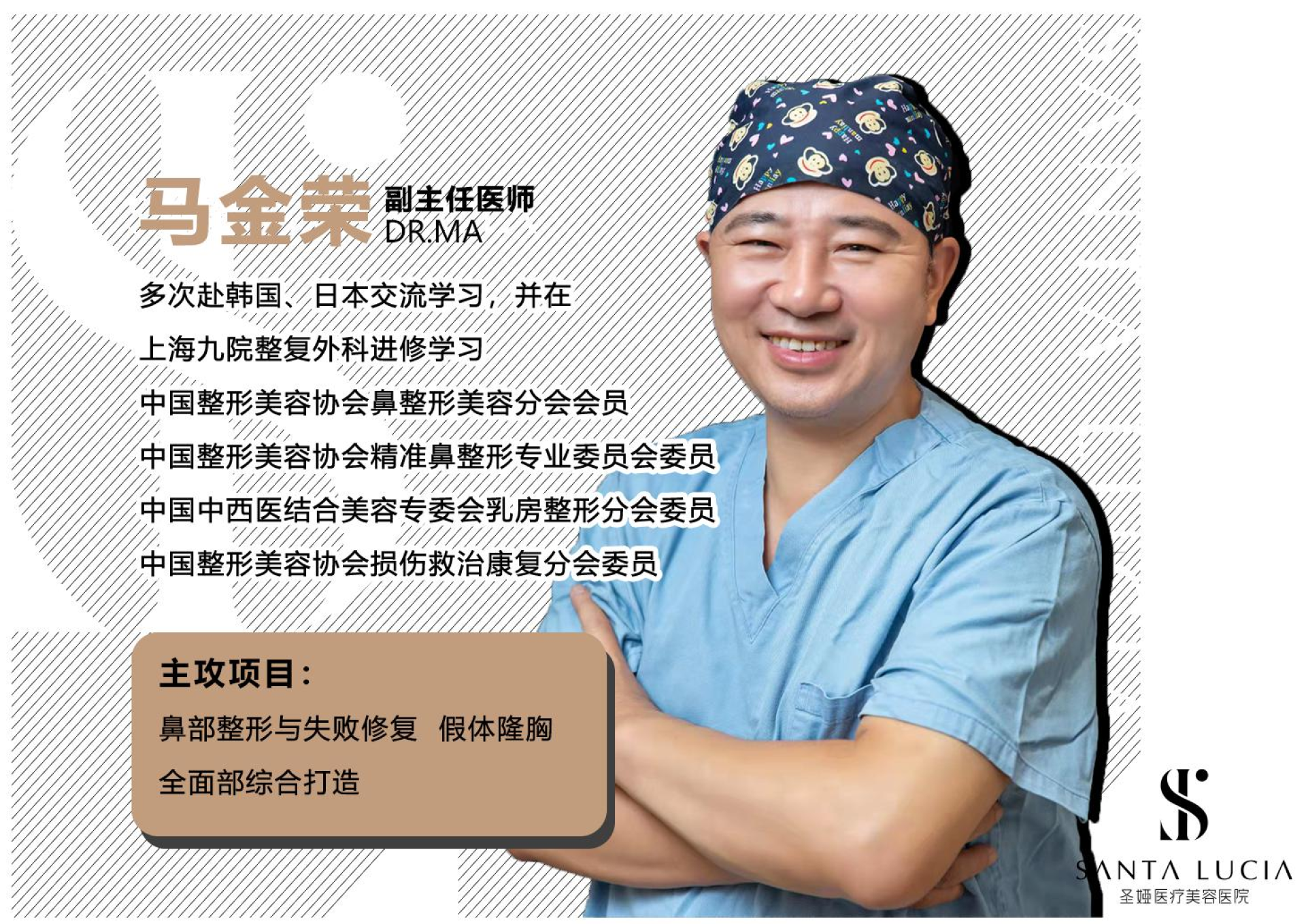 ศัลยแพทย์ 马金荣 (หม่าจินหรง) หรือคุณหมอหม่า เป็นรองหัวหน้าแพทย์ที่โรงพยาบาลศัลยกรรมความงาม Santa Lucia โดยท่านมีประสบการณ์มากกว่า 30 ปีในด้านศัลยกรรมตกแต่งและความงาม